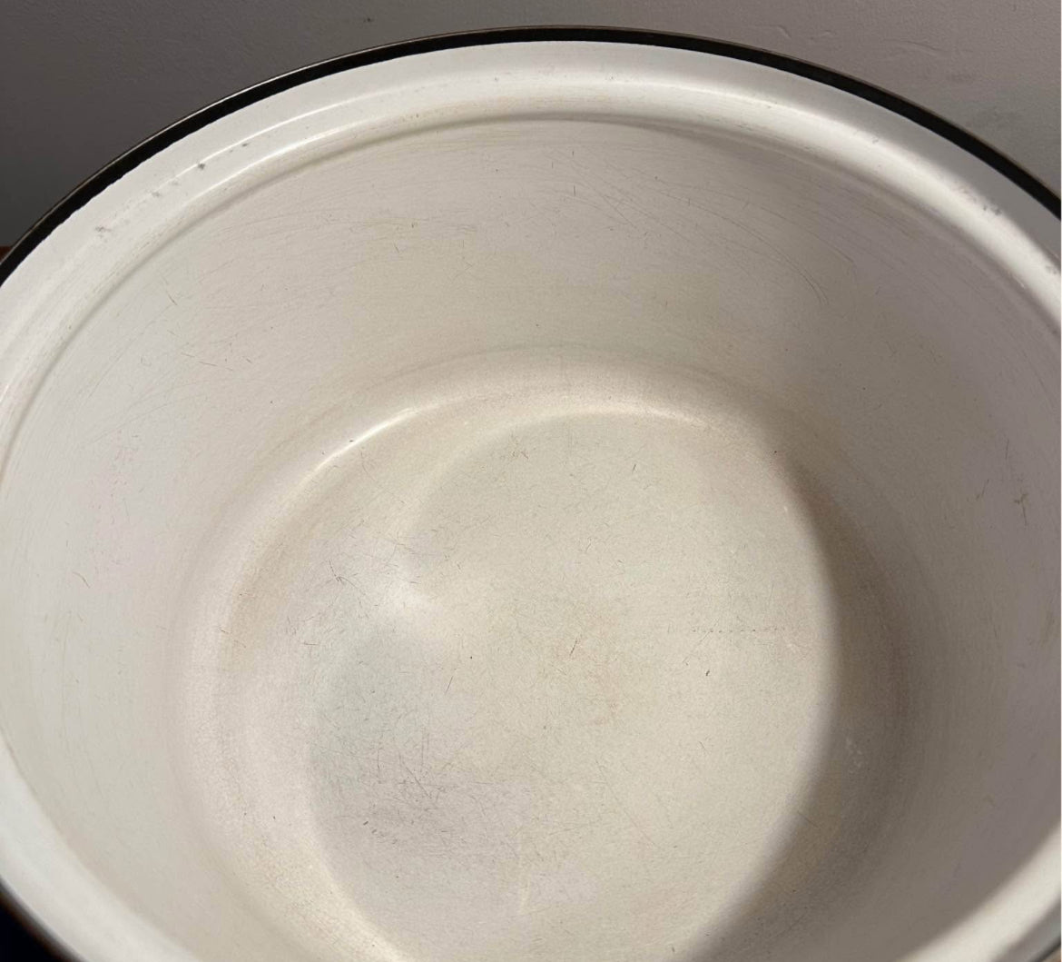 A true collectible from the golden age of Scandinavian design, this vintage Cathrineholm enamel pot features the now-iconic Lotus pattern—dark blue leaf motifs on a crisp light background, complete with a matching lid. Designed by Arne Clausen in the 1960s and produced in Norway, the Lotus series quickly became a worldwide sensation, its bold yet simple graphics capturing the spirit of mid-century modern style.